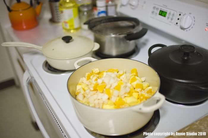 4. 将苹果块橙肉柠檬汁放入一个厚底大锅,把这三样水果搅拌均匀