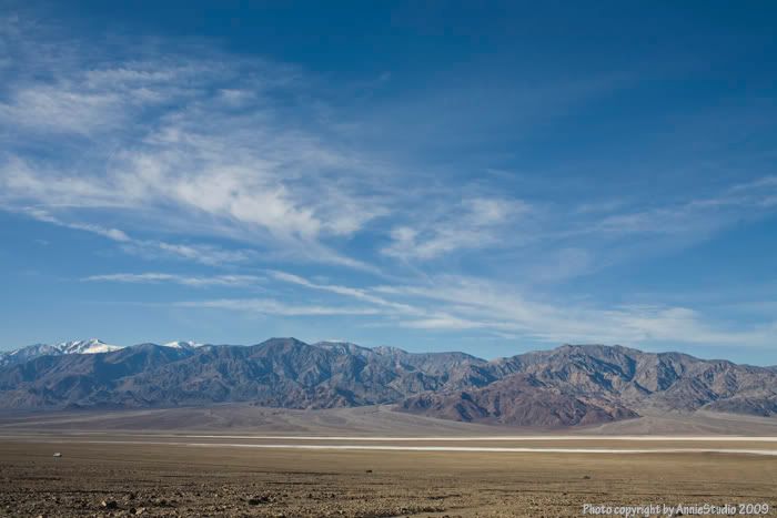 带着拉斯维加斯纯享受式生活的后遗症,我们开车进了死亡谷。我不知不觉地把车里的音乐调到很大声。LG觉得很奇怪,因为我平时不喜欢车内太吵,于是问我为什么。我说,在这里开车,让我感到很孤独,在大峡谷里徒步的时候也没有这样强的孤独感,停着音乐感觉还和这个世界连着。也许是拉斯维加斯的喧嚣和这里的寂静对比太大了。死亡谷里面的公路不宽,对开2车道,每条车道刚好容下一个车身。路还算平,只是起起伏伏,开快了,就有坐过山车的感觉。车不多,偶尔能看到一两辆,大家车速不同,方向不同,很快就看不到了。