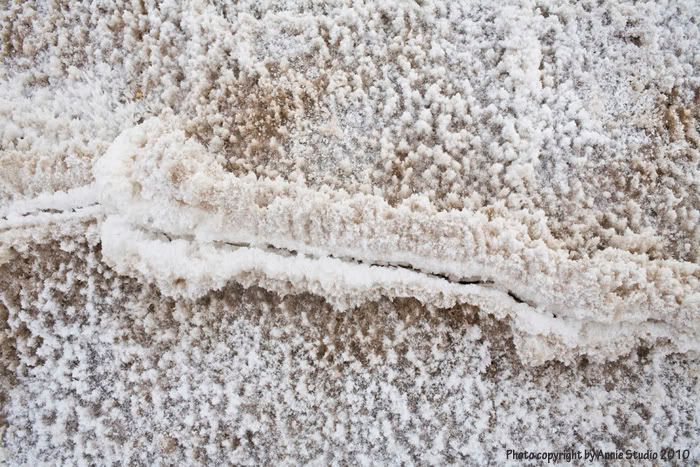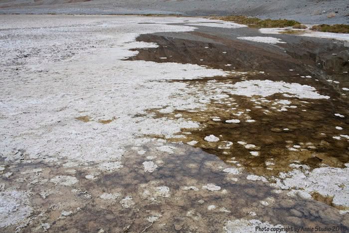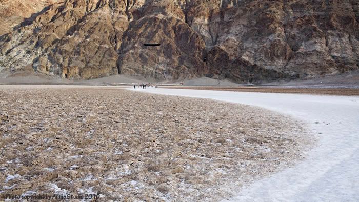 开了很久才到bad water。这里是全美国最低点海平面以下85米。虽然常年干旱,可这里全年都会有这样一汪水。不是sweet water,是咸水,不能喝,得名badwater。水里面的主要成分就是盐。旁边白花花的就是盐的结晶了。雨季的之后,水会多些。2005年,雨水很充沛,这里就变成一个大盐湖。