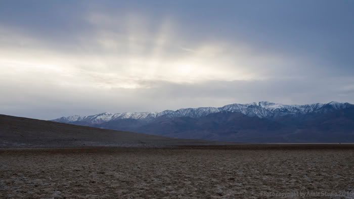 死亡谷是条南北向的峡谷,大山就在它的东西两侧,因此谷中很早就天黑了。当过4点,太阳就快落山了。