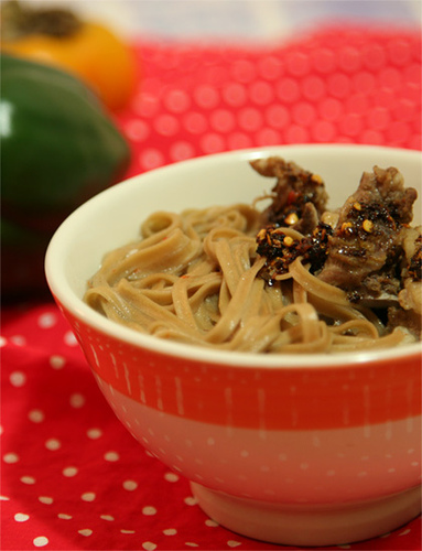 9. 出锅。倒在煮熟的荞麦面里面,配上油泼辣子,就能吃了。