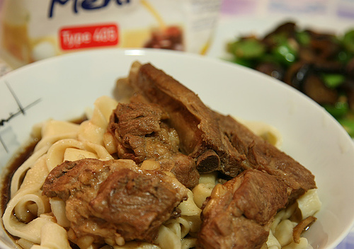手擀面浇上炖好的排骨,真是既美味又有营养,别忘了配上些青菜哦