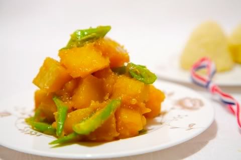 3. 锅热油,放入干辣椒,出香味后,放入南瓜,同时放入少许糖,不停翻炒,注意不要糊锅
