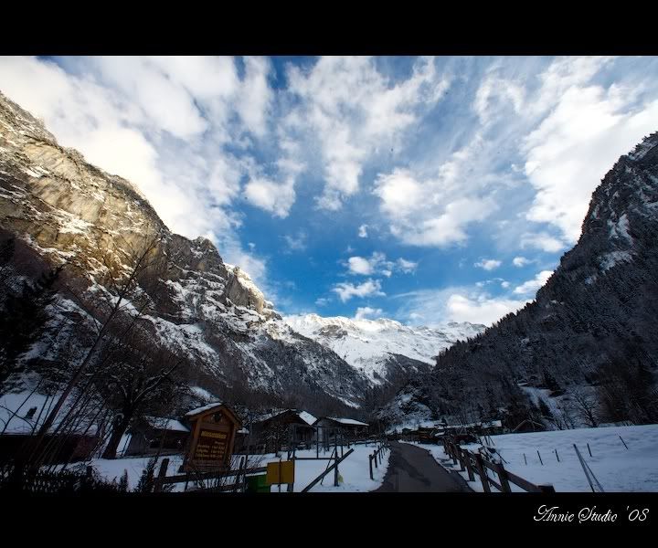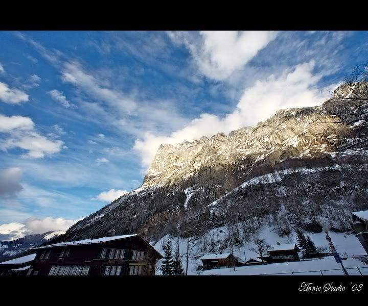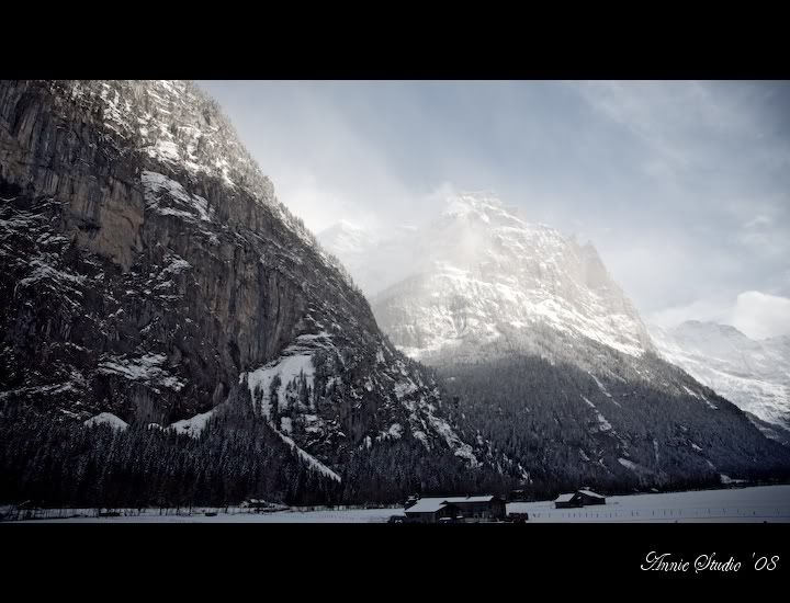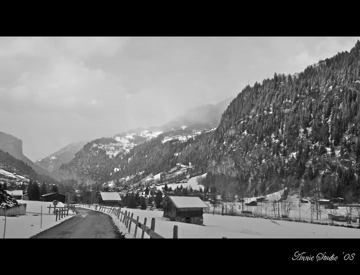 到达Interlaken的Lauterbrunnen时,天空还是阴阴的,远处雾蒙蒙一片,本想随便停一下就走。