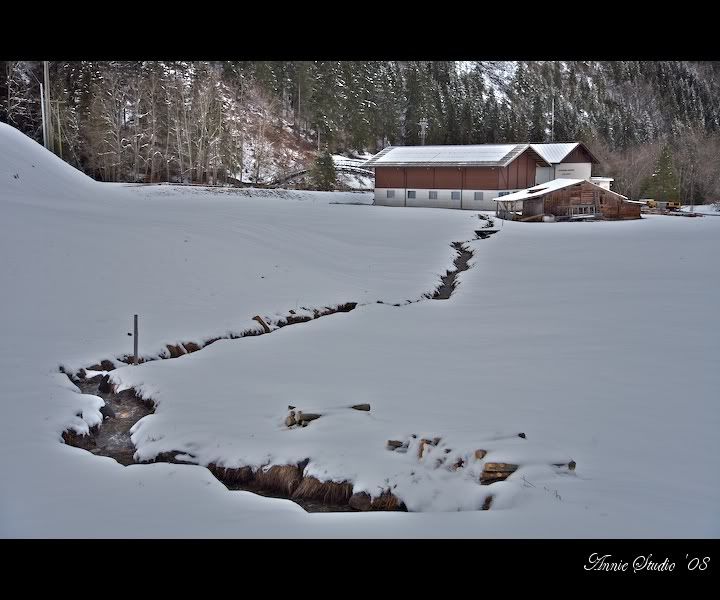 也是这样的白雪皑皑,小木屋,屋前的小溪