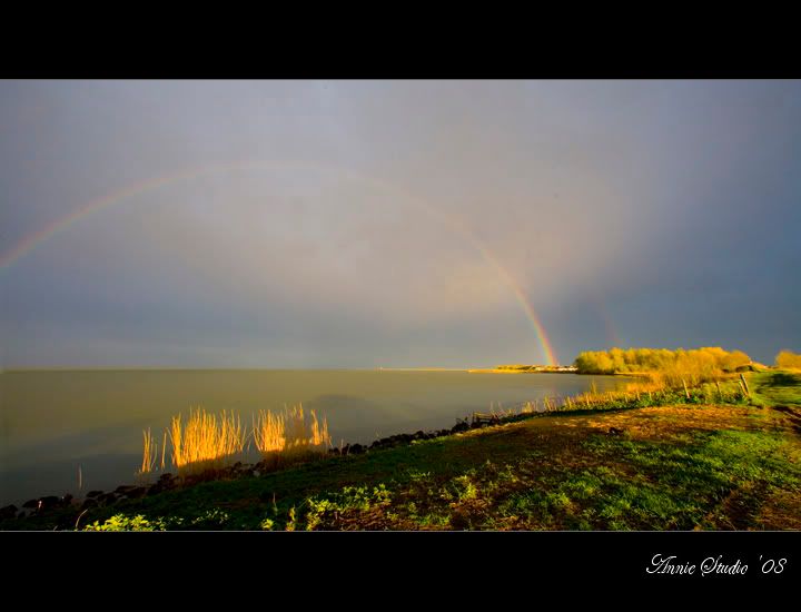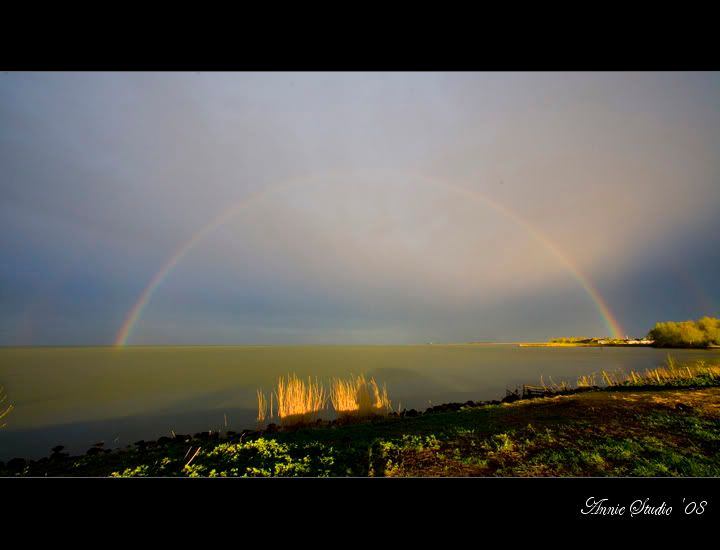 我惊讶的合不上嘴了,从没有看过这么完整的彩虹。太阳让彩虹下面的海变成了金色。
