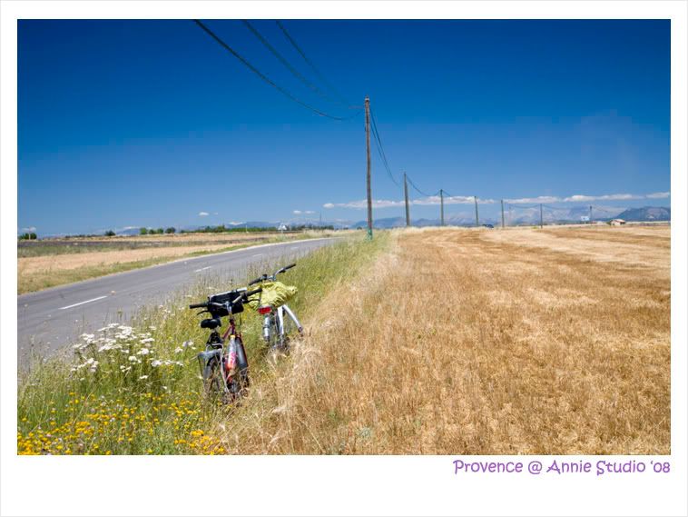 Manosque是一座默默无闻的普罗旺斯小城,一般的旅行者不会选择这里,我为了我的熏衣草梦,鬼使神差的选了这里作为通往熏衣草田的基地。我们到城里唯一的一间自行车行租了车,找到旅馆,问好晚饭时间,买了水和三个小密瓜,就骑向了Valensole,单程25公里。骑过大概5公里后,就全部是上坡了,没有平路没有下坡。太阳很烈,天很蓝,知了叫不停,20公里的纯上坡着实让人抓狂。越骑坡度越小,太阳也越来越晒,我想我们是到了一个小高地了,空气中弥漫的不仅仅是阳光的味道了好像还有点香味。一大片熏衣田草很快就出现在眼前了,看到的那一刻兴奋到忘记拿出相机,就顾着看啊看闻阿闻。又骑了一会儿,熏衣草好像都藏起来了,路的两边变成了收割后的麦田,我也终于打开了相机。